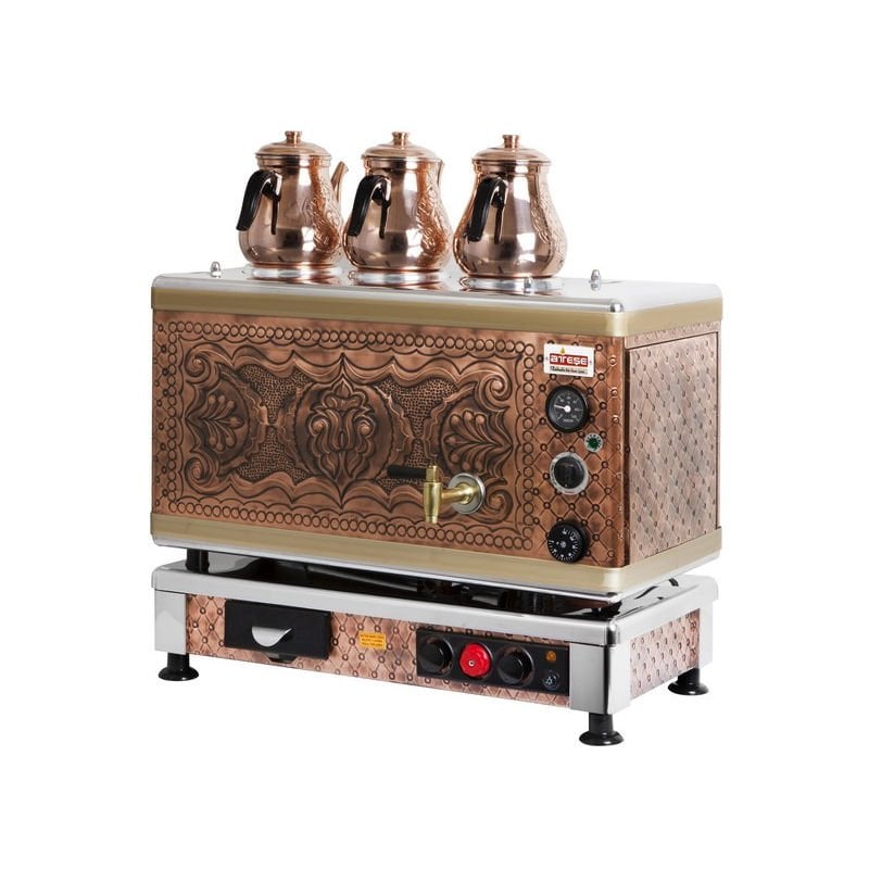 Model: Ateşe Gold Otomatik Gazlı Elektrikli Bakır 3 Demlikli Çay Kazanı, 34 Litre
