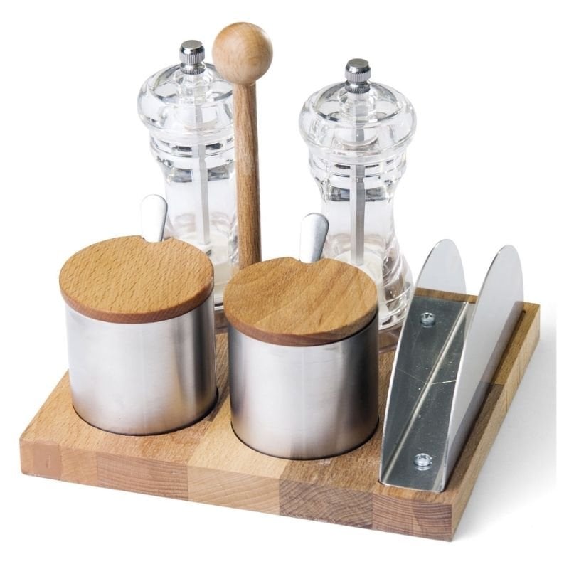Biradlı GRV-86 Ahşap Standlı Akrilik Tuzluk Baharatlık Takımı, 5’li