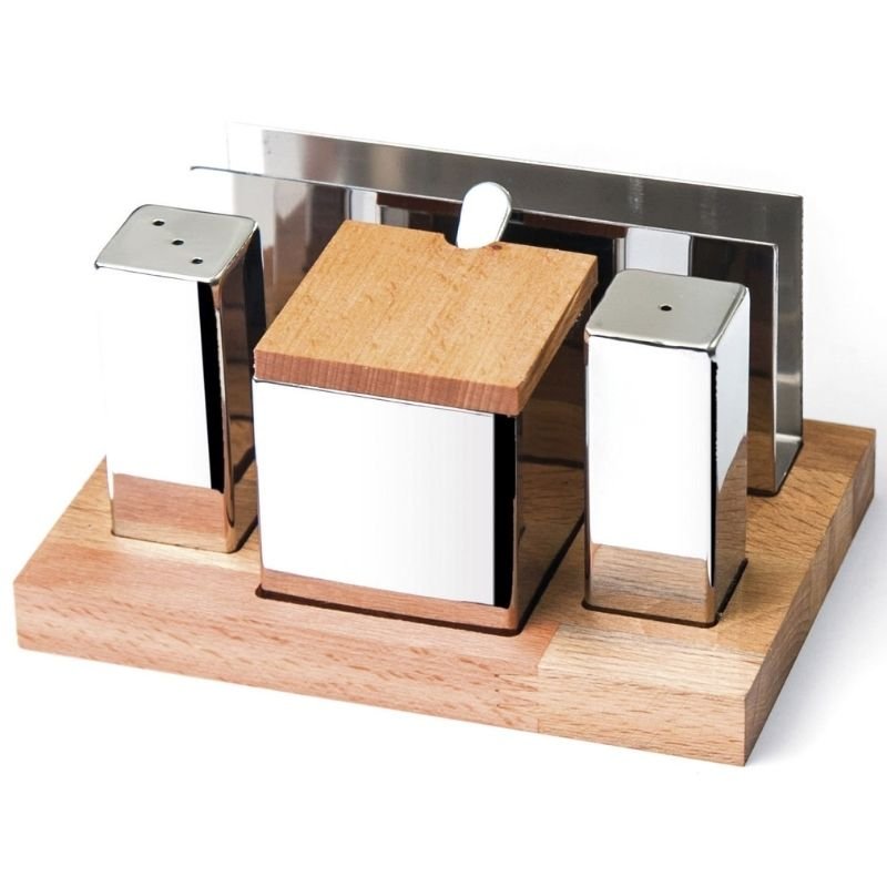 Biradlı GRV-93 Ahşap Standlı Parlak Tuzluk Peçetelik Takımı, 4’lü