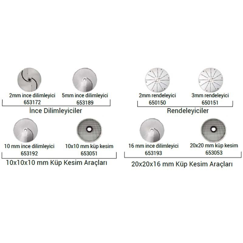 dilimleyici, 10x10mm küp kesim, 2mm ve 3mm rendeleyici, 16mm ince dilimleyici,