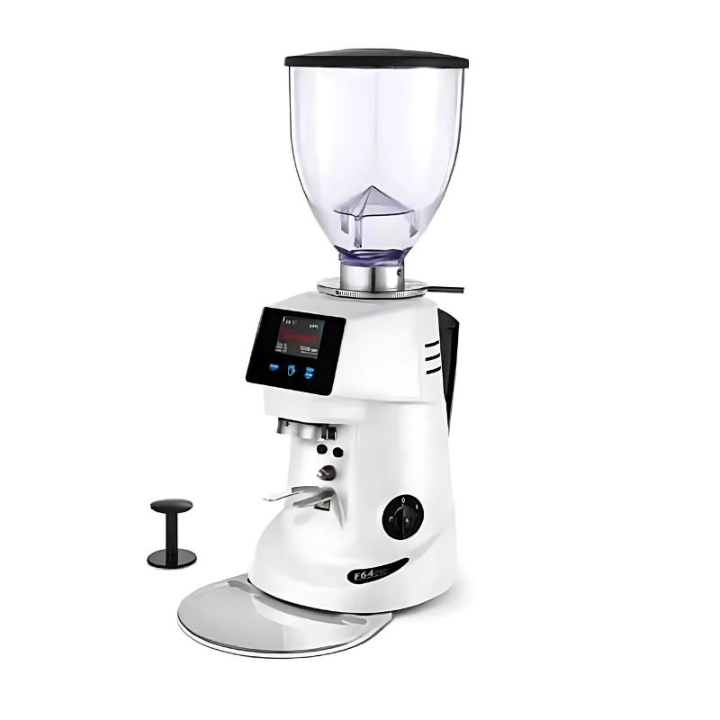 Fiorenzato F64E On Demand Kahve Öğütücüsü, kullanıcılara elektronik bir kahve değirmeni olarak beyaz renkte sunulur.