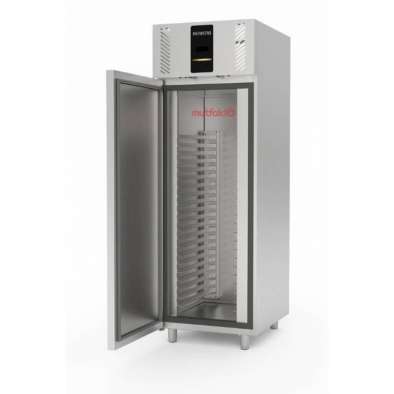 Ndustrio pastane dolabı, 43°C’ye kadar tropikal şartlarda dahi yüksek performans gösterir. Dayanıklı paslanmaz çelik iç ve dış gövdesi ile uzun ömürlü kullanım sunar. Kapılarda yer alan yoğuşma önleyici rezistanslar ve otomatik kapanabilen 90° menteşe sistemi, hijyen ve enerji verimliliği açısından büyük avantaj sağlar.