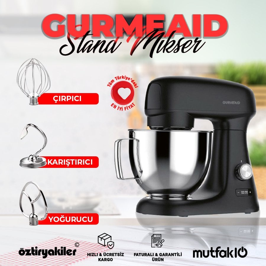 Öztiryakiler Döküm Gurmeaid Stand Mikser, şık ve sağlam yapısıyla ev ve iş yerlerinde kullanım için tasarlanmıştır. 4,8 litre kapasiteli paslanmaz çelik karıştırma kabı ve güçlü motoru sayesinde çeşitli hamur işleri ve yemek tarifleri için ideal bir seçenektir. Ayrıca, değiştirilebilir aparatları sayesinde farklı işlevleri yerine getirebilir ve işlerinizi kolaylaştırabilirsiniz. Şık siyah tasarımı ve dayanıklı döküm gövdesi ile de mutfağınıza şık bir görünüm katacaktır.