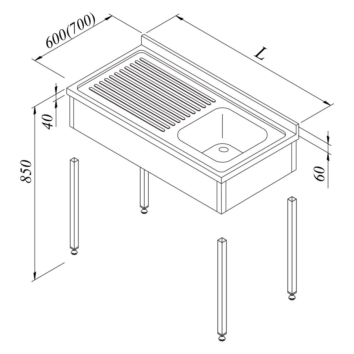 Üst tablaya 1 adet 400x400x250 mm ölçülü pres baskı monoblok evye gözü dikiş kaynak yöntemiyle kaynaklı.