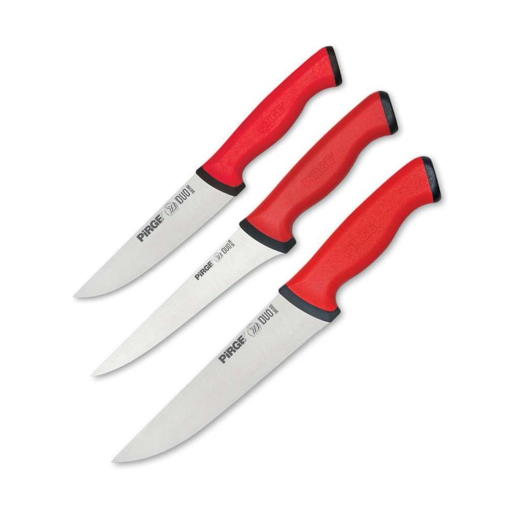 Pirge DUO Serisi, profesyonel şeflerin ve profesyonel kasapların özellikle et sıyırma, dilimleme, doğrama ihtiyaçlarını karşılamak için kaymaz sap teknolojisiyle üretilmiş performans bıçaklarıdır.  Pirge’ye özel yüksek karbonlu, molibden ve vanadyum alaşımlı Fransız konik çeliklerin kullanıldığı DUO serisi bıçaklar, Pirge P+ keskinlik ömründedir. Buzul ısıl işlem uygulanarak üretilen DUO serisi 5 yıl paslanmazlık garantilidir. DUO serisi kaymaz sap teknolojisiyle üretilmiş, sap içindeki uzun çelik boyu ile sağlam ve güvenli bir tutuş sağlamaya yardım eder.  Elden kaymayan saplı, yüksek performanslı, profesyonel kalite et bıçaklarını kullanmak için DUO serisini tercih edebilirsiniz. Kurban bayramında et kesme işlerinizi kolayca yapmanızı sağlayacak DUO Profesyonel Kasap Kurban Bıçak Seti 3’lü ile evinizde ve işinizi bıçak ihtiyacınızı profesyonel kalitede karşılayabilirsiniz. 12,5 cm küçük boy et bıçağı ile etleri doğrayabilir, derileri yüzebilirsiniz. Günlük mutfak bıçağı ihtiyacınız için de kullanabilirsiniz. 14,5 cm sıyırma bıçağı ile eve kemikli gelen etleri kemiklerinden ve sinirlerinden kolayca sıyırabilirsiniz.19 cm büyük boy et bıçağı ile Kurban kesebilir, büyük parça etleri küçük parçalar haline getirebilirsiniz. Sağlam çelik yapısı ile büyük sebzeleri, meyveleri kesmek için de kullanabilirsiniz.