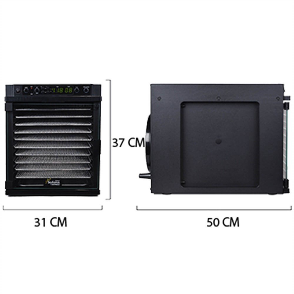 Sedona Express Meyve ve Sebze Kurutma Makinesi’nin ön panelinde bulunan dijital termostat sayesinde kurutma işlemlerinde istediğiniz dereceyi net olarak belirleyebilirsiniz. Şeffaf cam kapağı sayesinde kurutucunun içerisindeki işlemin ne aşamada olduğunu rahatlıkla görür, paslanmaz çelik tutma kolu ile kapağı açabilirsiniz. Kapak açıldığı zaman LED ışıklar yanar ve kurutma işlemi otomatik olarak durup, kapak kapandığında tekrar kaldığı yerden çalışmaya devam eder.